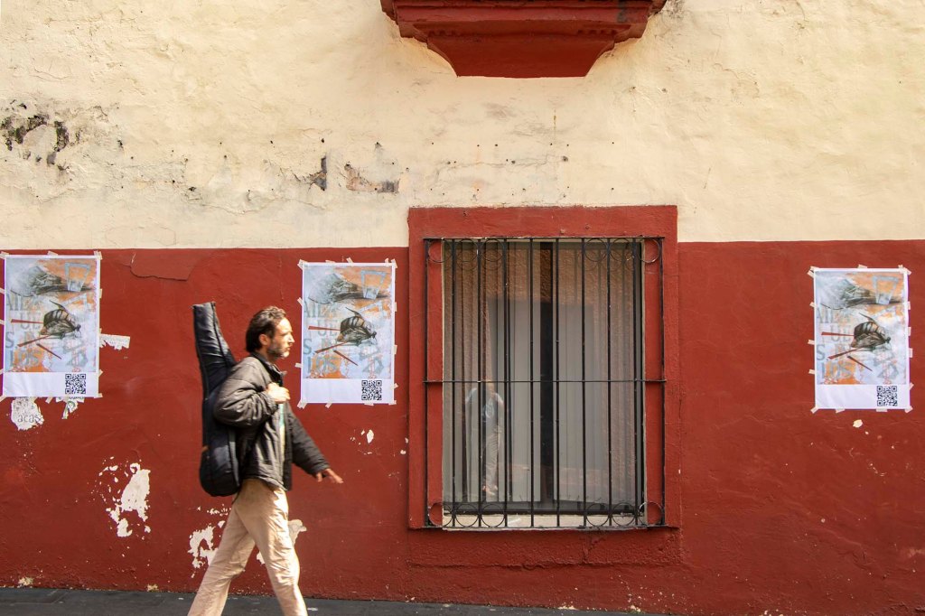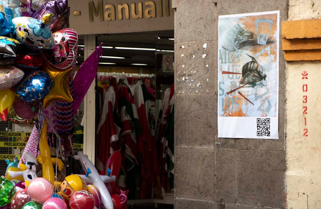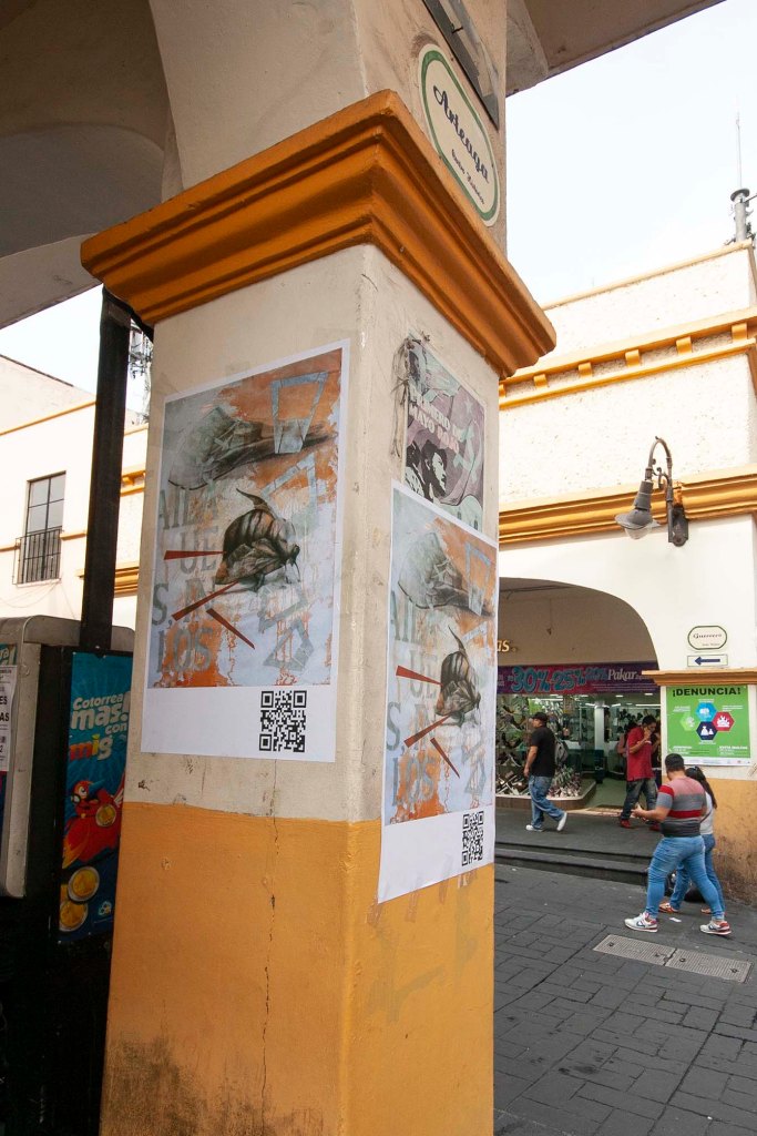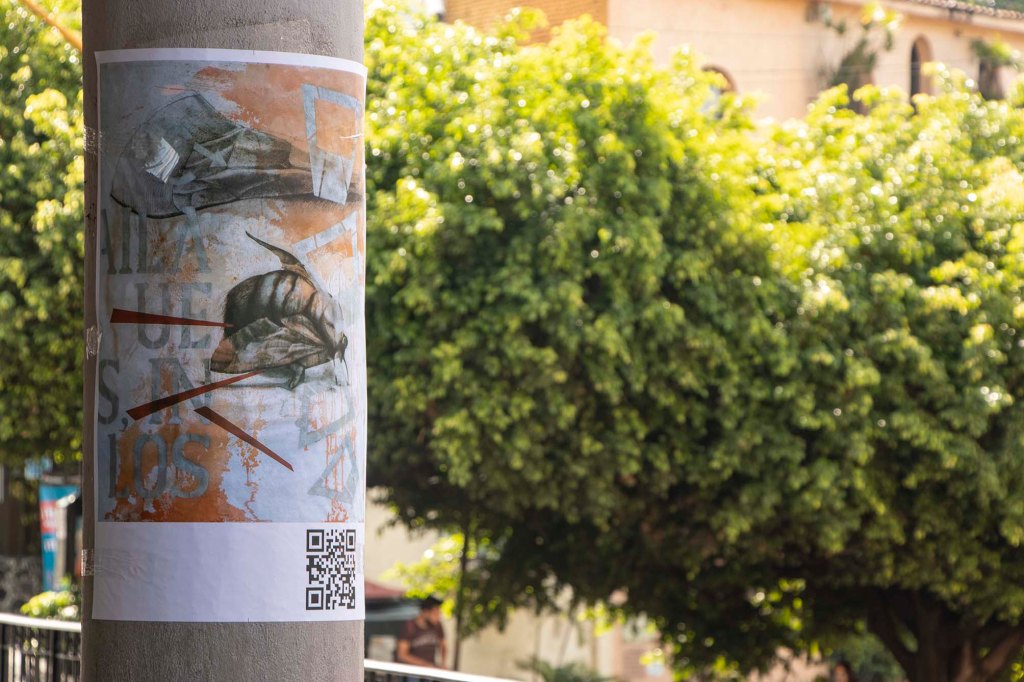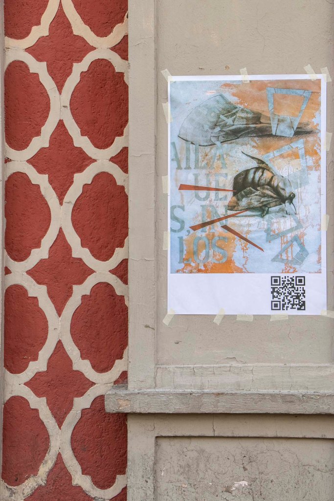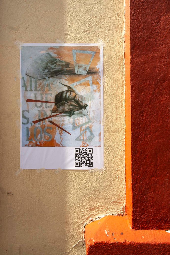 Como parte de la exposición realicé el cartel cuyo QR te vinculó a esta página. No solo se trata de publicitar la exposición, sino también de realizar una reivindicación al cartel y sus nexos con actividades culturales. En una ciudad indiferente e insensible a las propuestas de creatividad gráfica y cada vez más distanciada al ejercicio del pensamiento, empapelarla con mis imágenes también corresponde a una intervención del espacio público como gesto que llama a despertar del letargo que disuelve la idea de ser ciudadanos día a día.